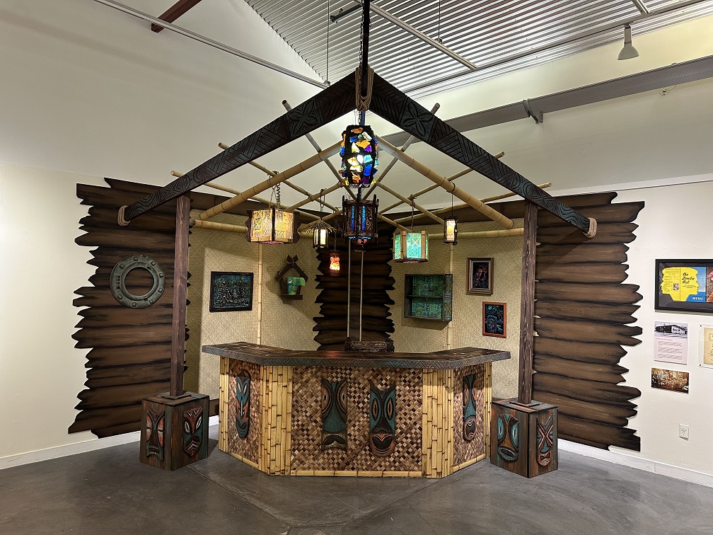 At the back of the museum, the space is left pretty wide open intentionally. Tiki-themed event parties are scheduled throughout the run of the show A nifty corner bar, created by Woody Miller, is the focal point on those occasions, as libations are available there under the bar’s exotic hanging lamps. (After all, what would an exhibit celebrating tiki cocktail culture be without cocktails of its own?) A tiki mug commemorating the show (also designed and created by Miller) is available—but only at those special soirées.