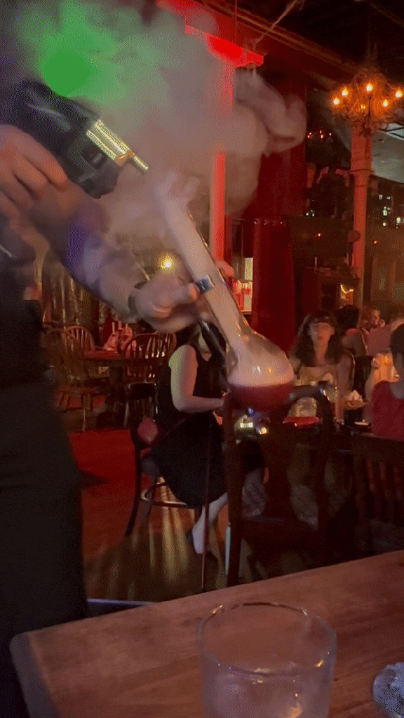 As our meal was concluding, we ordered nightcaps. I had the Dr. Raven’s Reserve—a bubbling concoction served in a flask.