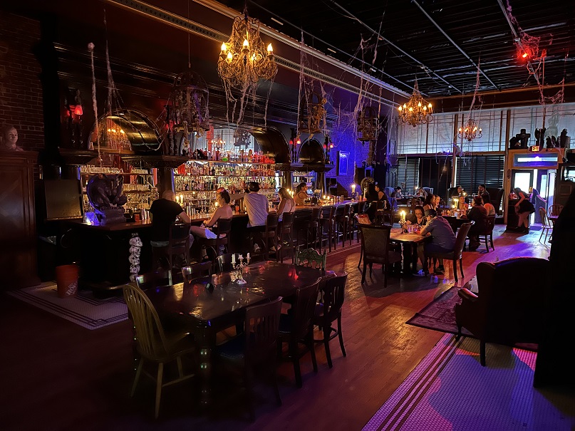 There is a place called Raven’s Manor I had stumbled upon online. It is a restaurant/bar. It’s not a tiki at all, but rather something that is being called “tiki adjacent”. It’s a full-on immersive experience, very much like visiting a tiki bar. However, in this case, instead of thatch and bamboo you get cobwebs and horror!