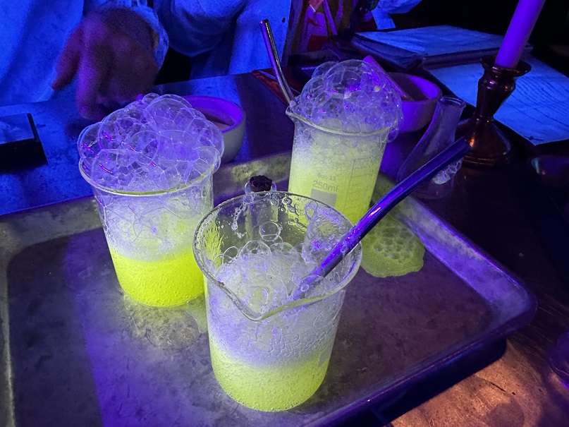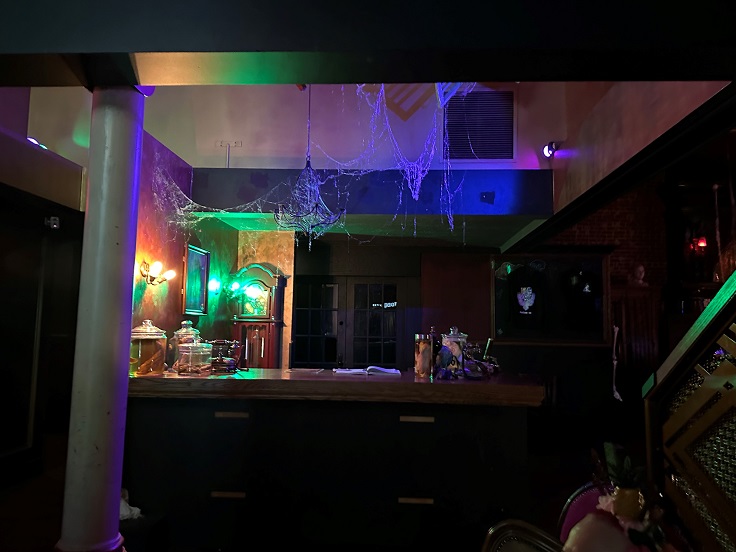 We arrived just behind another reservation-less couple. Darn it all. But, after a brief wait, we were seated in the lounge area next to the bar. This was a treat, as during our earlier visit we were confined to the escape room area all of the way at the back or in the secret laboratory chambers below the dining room. Now we were seated at a table in the corner, so we had a great view of the bar and the restaurant.