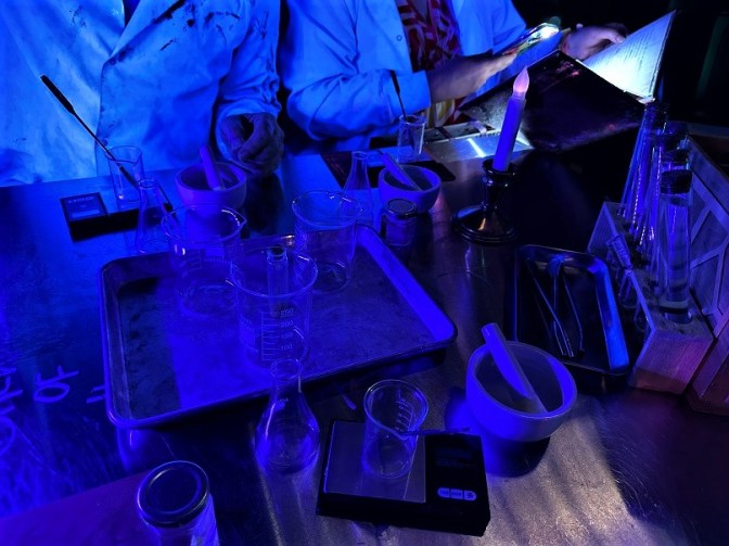 She took over the tour from there on, laying the groundwork for what was to come. In a second chamber, we were broken up into our original groupings of two or three. We were warned repeatedly of how to handle the equipment we’d be using and of how serious the consequences would be if we didn’t follow instructions to the letter. (Hence the waiver!) We would be using beakers, Bunsen burners, test tubes, small cauldrons, etc.