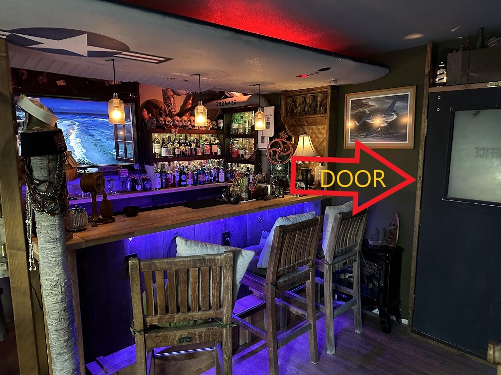 There is a door to the right of the bar with a glass window. The word “office” is painted on the other side as if a person walking up to it would think the bar was an office. Behind the window, Will has a large TV set up. He hopes to soon have it playing a video of workers in a machine shop with someone occasionally coming up to the door and wanting to speak to whomever is in charge—and someone else trying to dissuade the person from entering. Very cool.