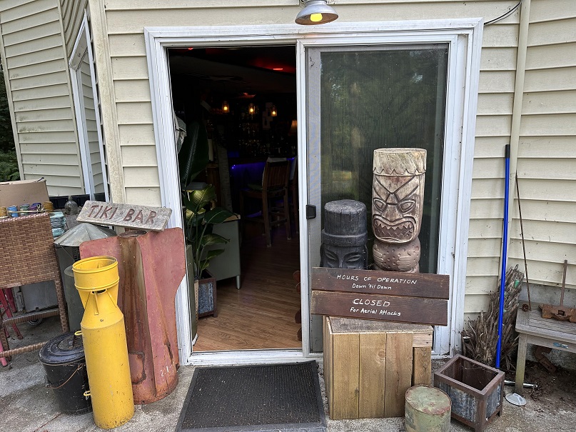 The exterior suggested a work in progress. But really, are any home tiki bars ever “finished”? There was a very curious pair of signs to the right of the door, though. One listed the hours of operation (“Dawn ‘til dawn”). Below that was another sign reading “Closed for aerial attacks”? Huh?