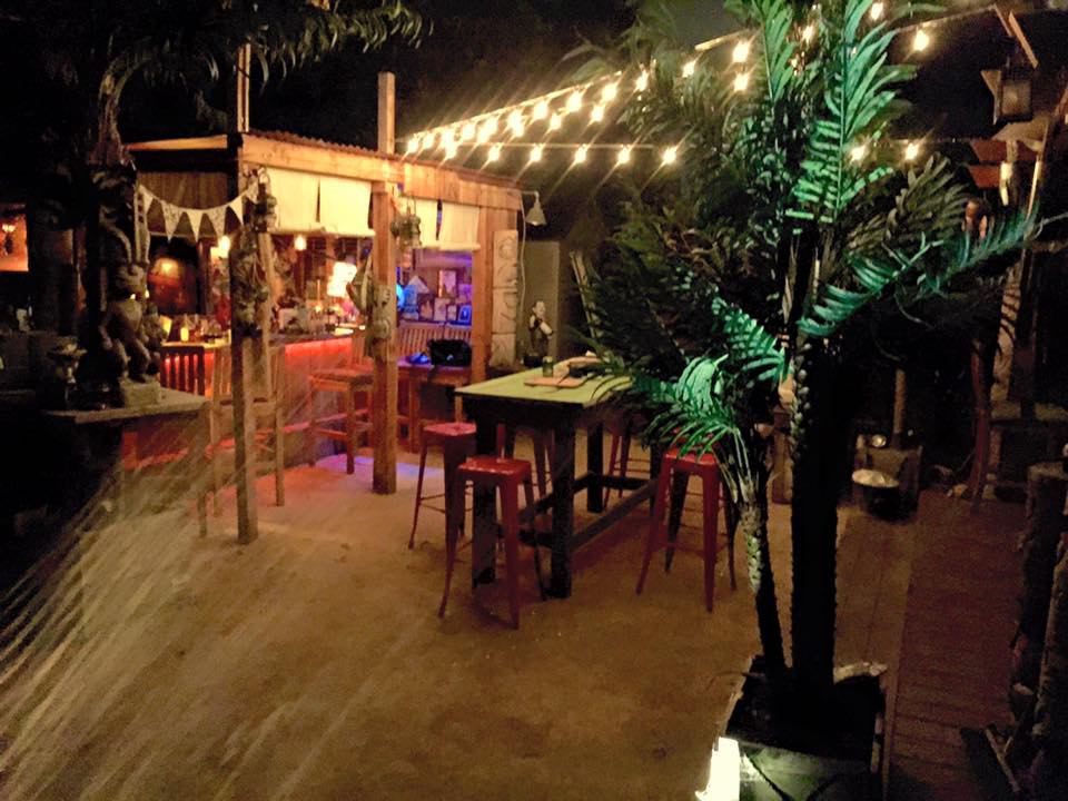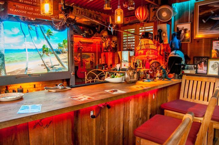 Was that a framed painting of some sort of fighter jet on the wall and, was that an old mortar that had been made into a lamp? What sort of tiki bar was this?