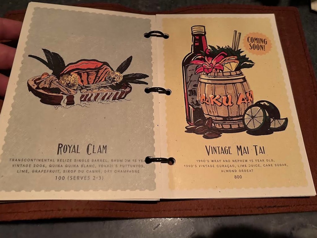 As I sat and sipped (oblivious to Skye and Erich who were deep in conversation next to me. I really couldn’t hear them that well.), I perused the menu more thoroughly. Jeepers! There was something called a Royal Clam and another called a Vintage Mai Tai. Both sounded incredibly fab, but… the Royal Clam (which served 2-3 people) was $100 and the Vintage Mai Tai (which served 1) was $800! Zoinks!