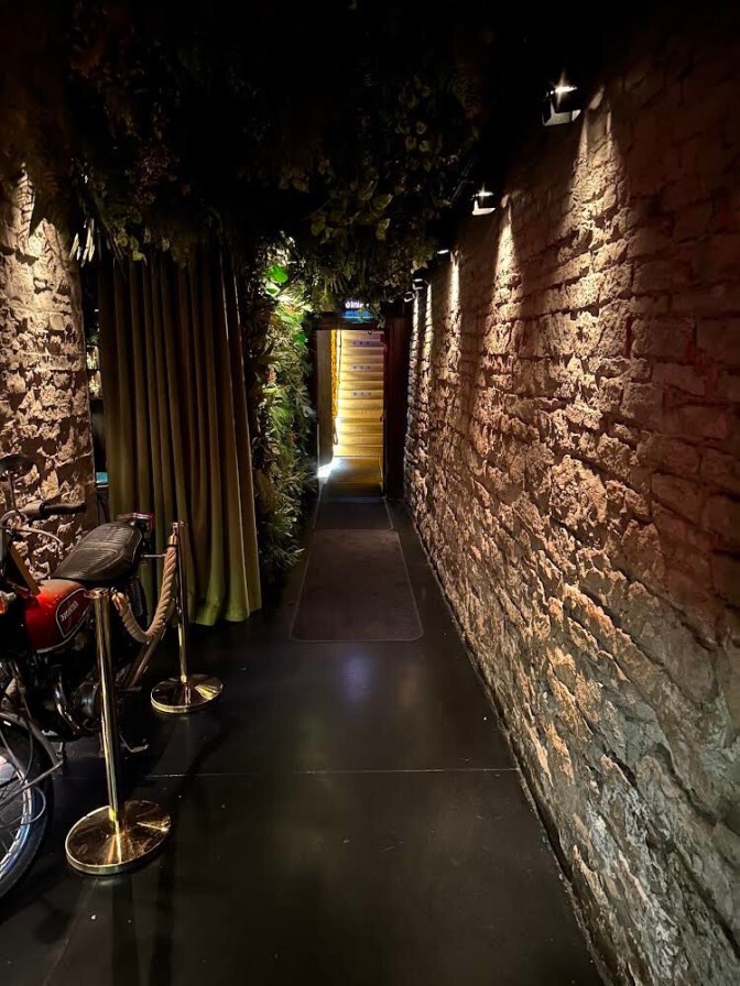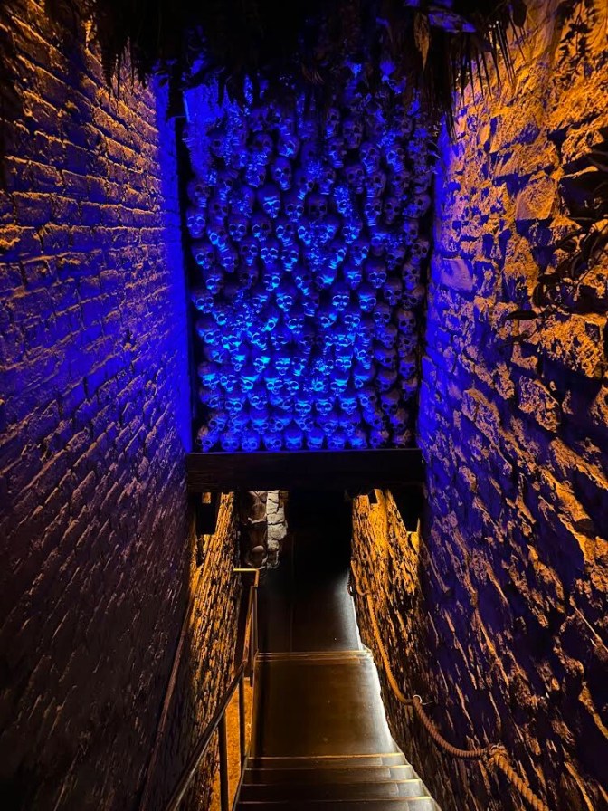 A security guard/bouncer stood at the entrance, checking IDs. Once you were cleared, you pulled open a door, walked down a short corridor, and turned to face a long stairway (There is apparently no elevator.) leading down to a basement level—all beneath an amazing wall of skulls bathed in blue light. It looked so awesome. I couldn’t wait to experience the place.