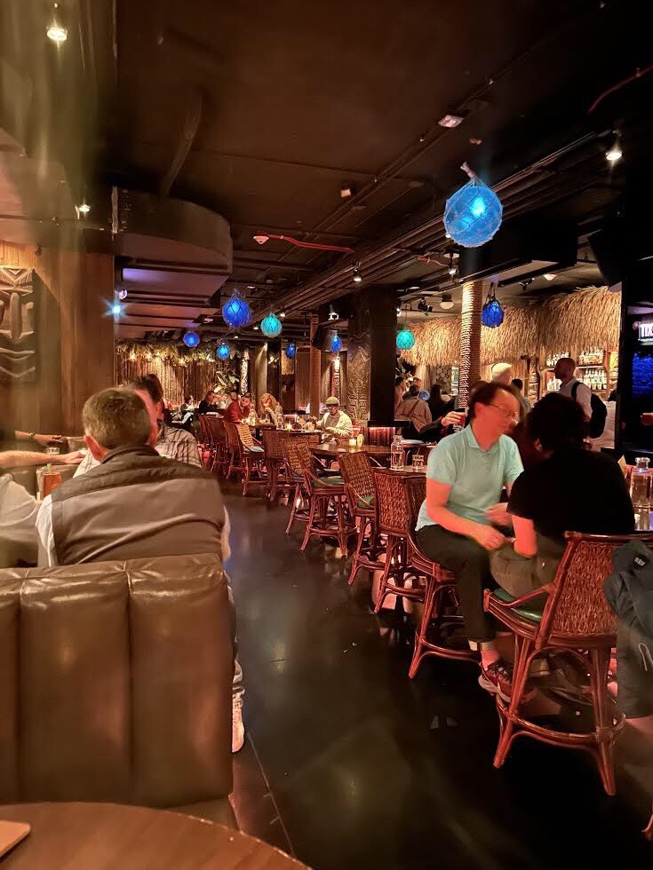 We were eventually seated in a back corner of the bar. It was pretty happening…and on a Tuesday night! Wild. I was prepared to really like this place. And yet, something seemed…a bit off. Was it the obscure disco funk that was playing? The group of middle-aged frat brothers having a reunion (with lots of empty beer bottles) at the next table? The lack of anyone else wearing any sort of aloha wear? I couldn’t put my finger on it.