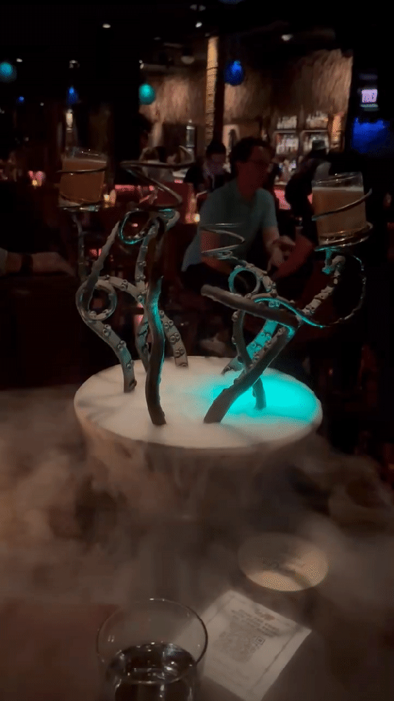 We had been sitting there for a while, when our waitress finally arrived. She was carrying this incredible, smoking sculpture containing two glasses of…something. She apologized for taking so long to come to our table. Apparently our table had been added to her stations and no one had told her. The drinks, presented in the the bar’s iron-tentacled SHOTSapus, were her way of apologizing. How nice…and amazing! (And absolutely delicious. The shots were a concoction of rums, passion fruit, pomegranate, lemon, absinthe, and bitters.)