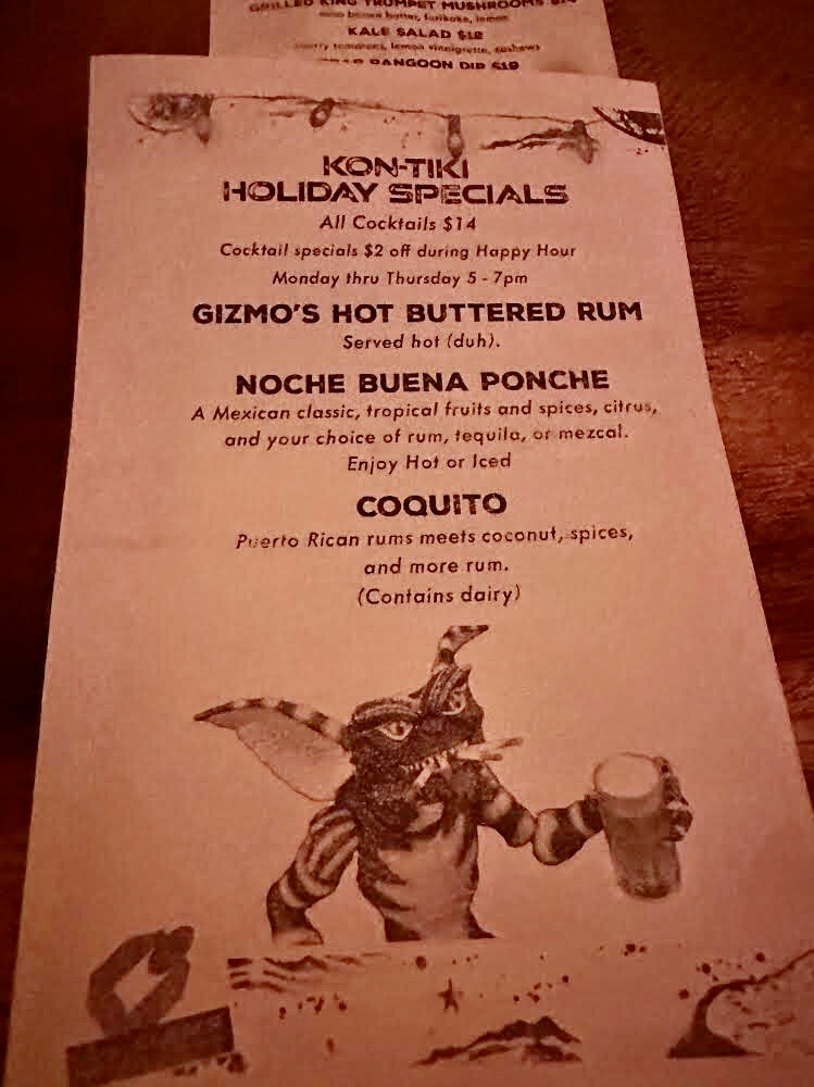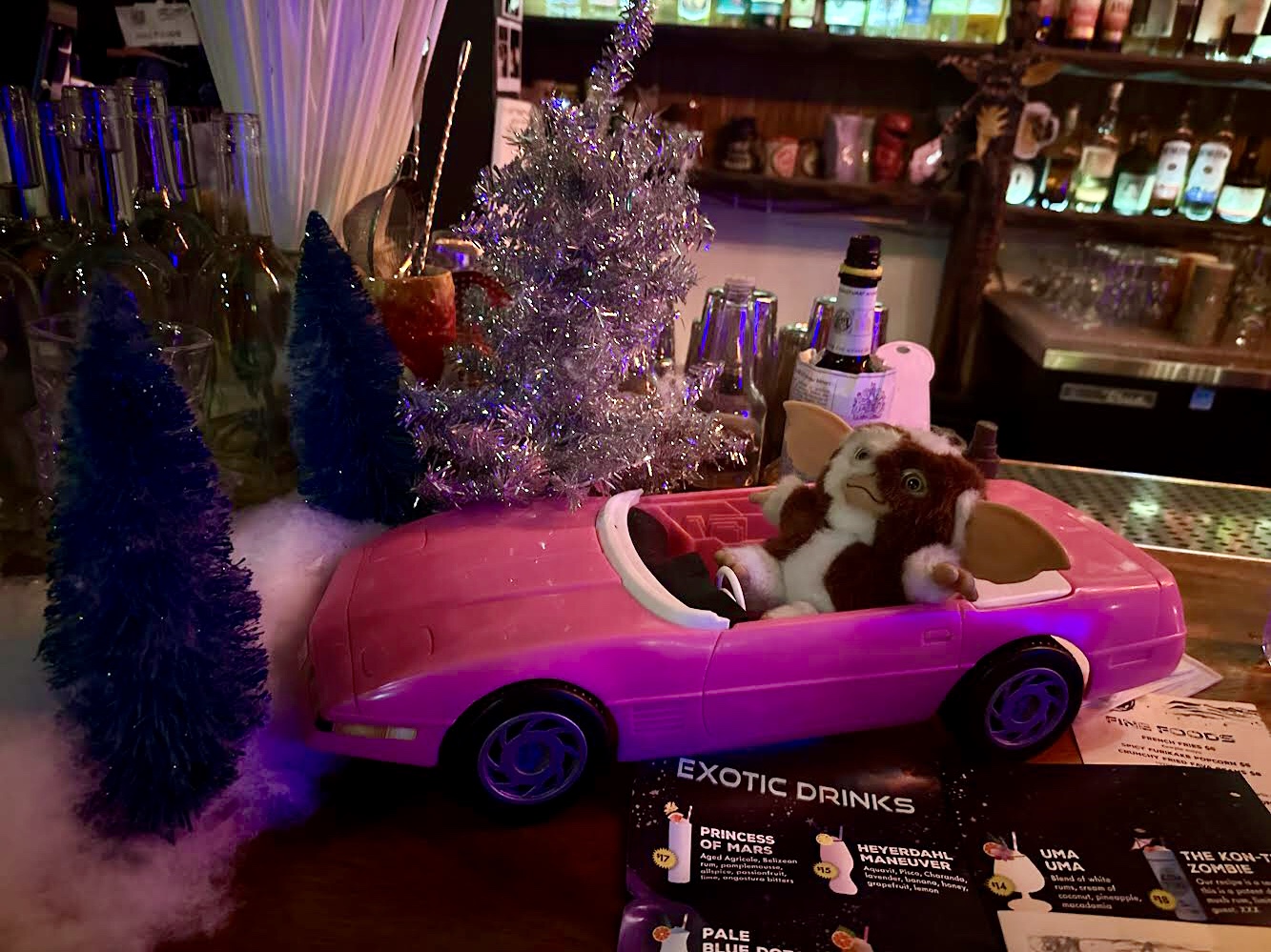 That’s exactly what I did. I found myself a spot at the very edge of the bar. The place was decorated for Christmas—albeit “Gremlins”-style. There were several Gremlin cutouts from the movie hanging from the bar and Gizmo was sitting in a car right in front of me. An unconventional Christmas, but Christmas none the less. (I had completely forgotten that “Gremlins” took place at Christmas.