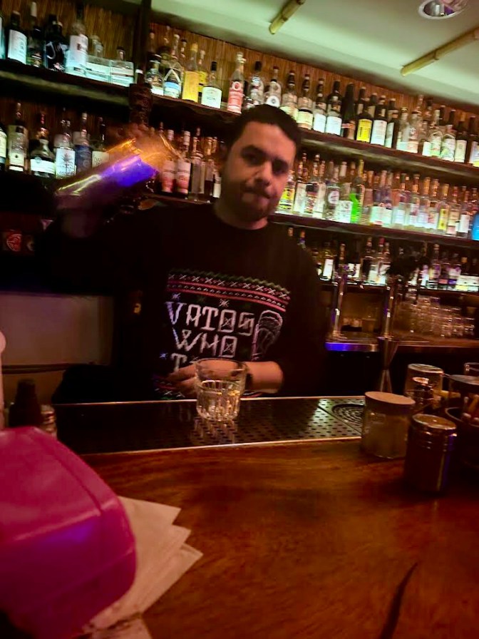 My sandwich arrived, but my Hot Buttered Rum was gone. I thought I’d try the next drink on the holiday menu, the Noche Buena Ponche. It could be served hot or cold. Oh dear… I asked Carlos which way her preferred it. That’s when I learned that he had not only created the drink, he’d come up with the recipe for the bar’s take on Hot Buttered Rum as well. He said he’d designed the Noche Buena Ponche to be served either way. I ordered one and told him to surprise me in the way he served it.
