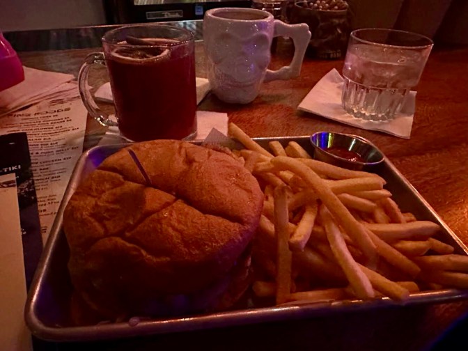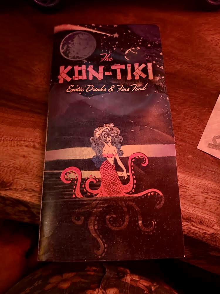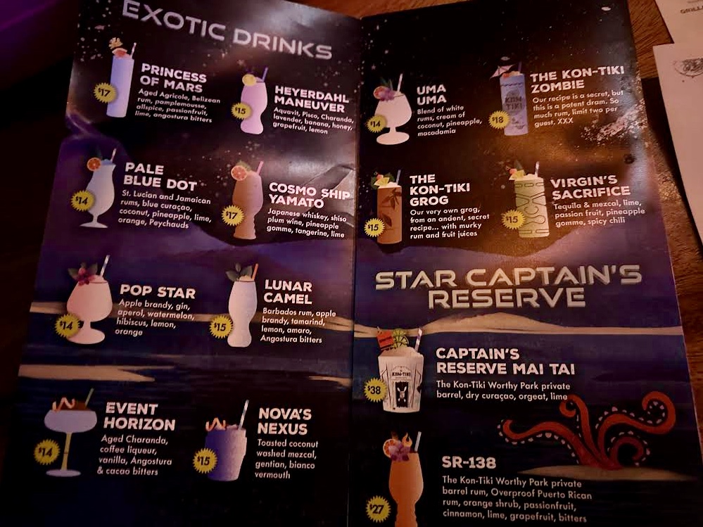 I had broken open the bar’s regular menu, which I was surprised to see had gone all space-age, science fiction-y. That was original and different for a tiki bar. (It also helped explain why many of the wall carvings were covered over in shiny, metallic Mylar.) But why not? Tiki is fantasy, after all. Some of the drinks listed in this menu contained things like plum wine, apple brandy, Japanese whiskey. Interesting.