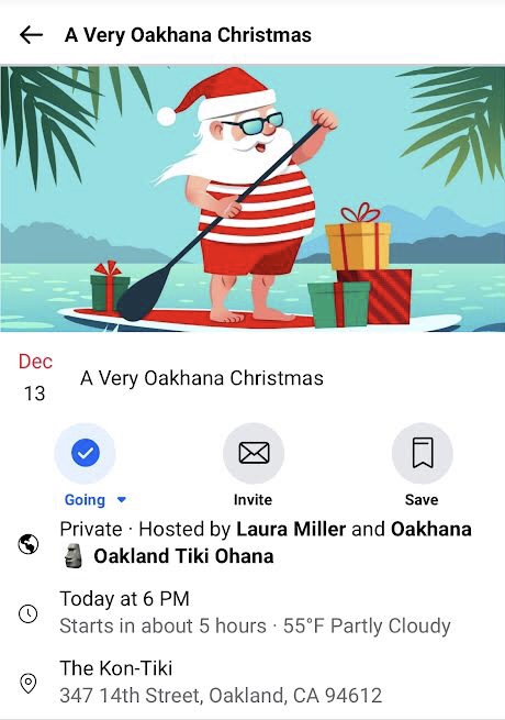 He had gotten me to join Oakhana, the Oakland Tiki Ohana on Facebook. Although I don’t live in Oakland, I am a native of the East Bay, having been born in Concord. I have lived in Pittsburgh (as an infant), San Jose (as a child), and in San Leandro briefly (as an adult). I frequently visit San Leandro, which is where I had been staying this trip. It’s not Oakland, but…