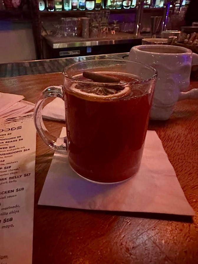My Noche Buena Ponche came hot. I don’t know what I was expecting, but it was different. It tasted like the holidays, with a mixture of tropical fruits, citrus, and spices. Kind of like a mulled cider…and with a choice of rum, tequila, or mezcal. I stuck with rum. It was good, but I wished I’d had it before the sweeter Hot Buttered Rum.