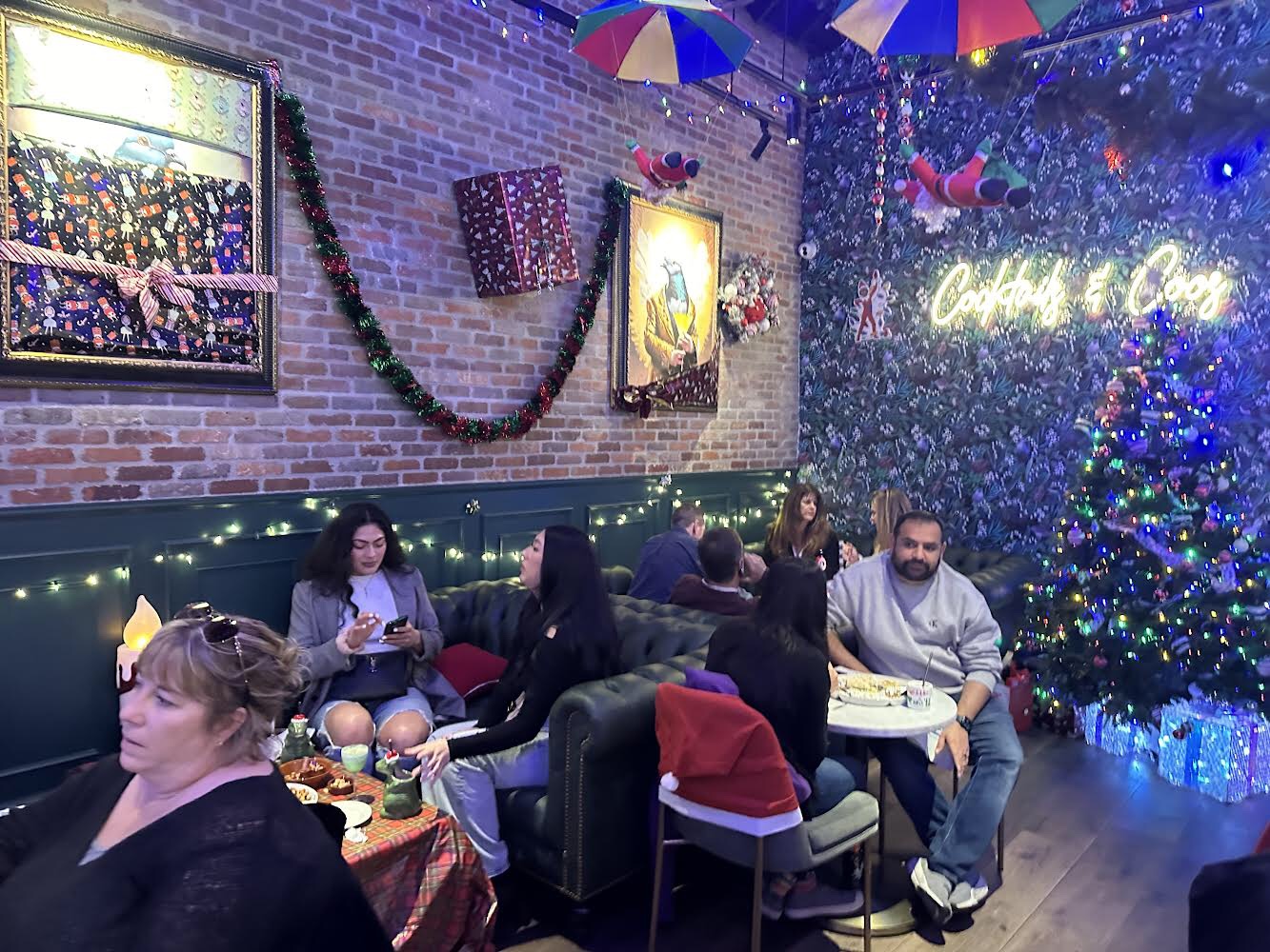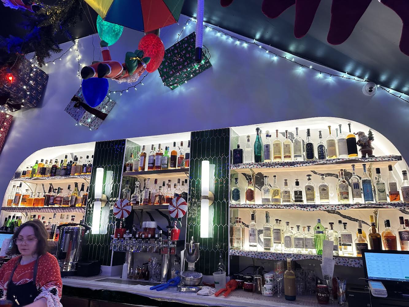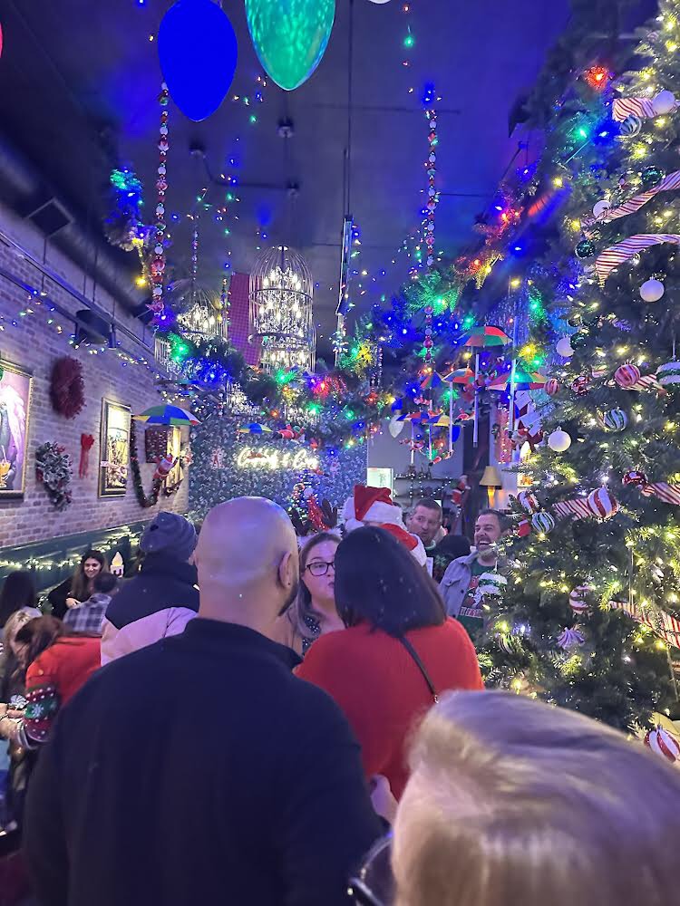 As we sipped, we got a better chance to look around at the place. While plentiful, it was not over-the top. The décor really added to the whole enchanting experience. There were Santas parachuting in over the bar, a replica of the leg lamp from “A Christmas Story”, and—although there was no chimney—Santa seemed to be stuck coming down through the roof!