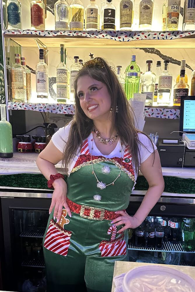 While the other staff members mostly wore Christmas sweaters, one of our bartenders was wearing a sparkly bartender elf outfit. She let me take her photo.