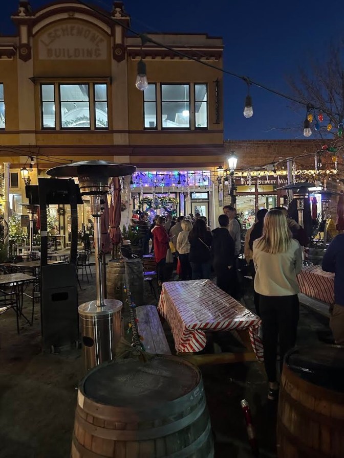 While we waited, I Googled Kevin’s write up about his experience at the bar to share with Nedra. I gave it a reread as well. The bar that is hosting this holiday event is a new place called The Fat Pigeon. Formerly a beer bar (Beer Baron), this new cocktail venture chose to debut itself to the town of Livermore, all wrapped up like a shiny, sparkly Christmas present. The Christmas-y aspect comes courtesy of Miracle, a company that has been creating seasonal saloons and wintery watering-hole wonderland pop ups since 2014. (Where have I been?) These Christmas pop ups are not confined to the Bay Area but can be found nearly worldwide. And just to make sure they make Santa’s “Nice” List (as if providing holiday cheer in a bar wasn’t nice enough), 10% of all profits from the holiday mugs sold at the pop ups benefit the Seva Foundation, a global non-profit eye care organization. Ho ho ho!