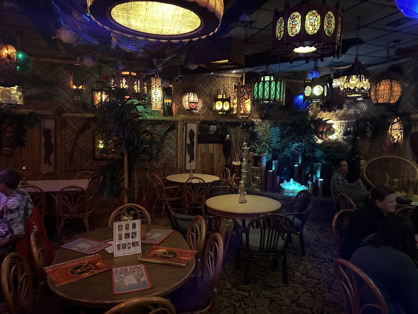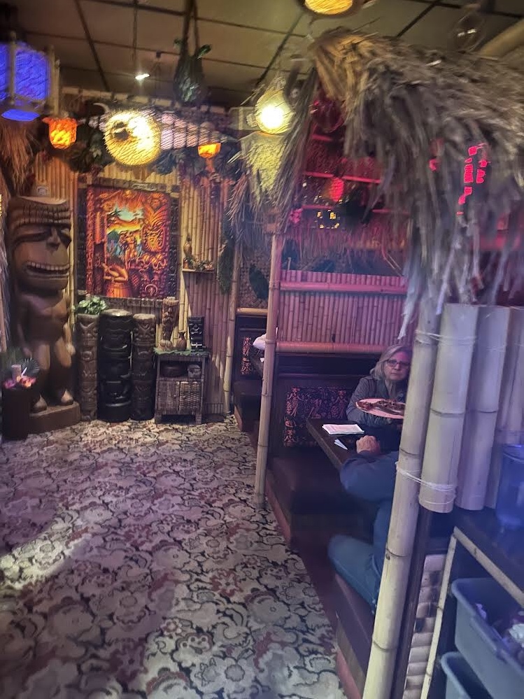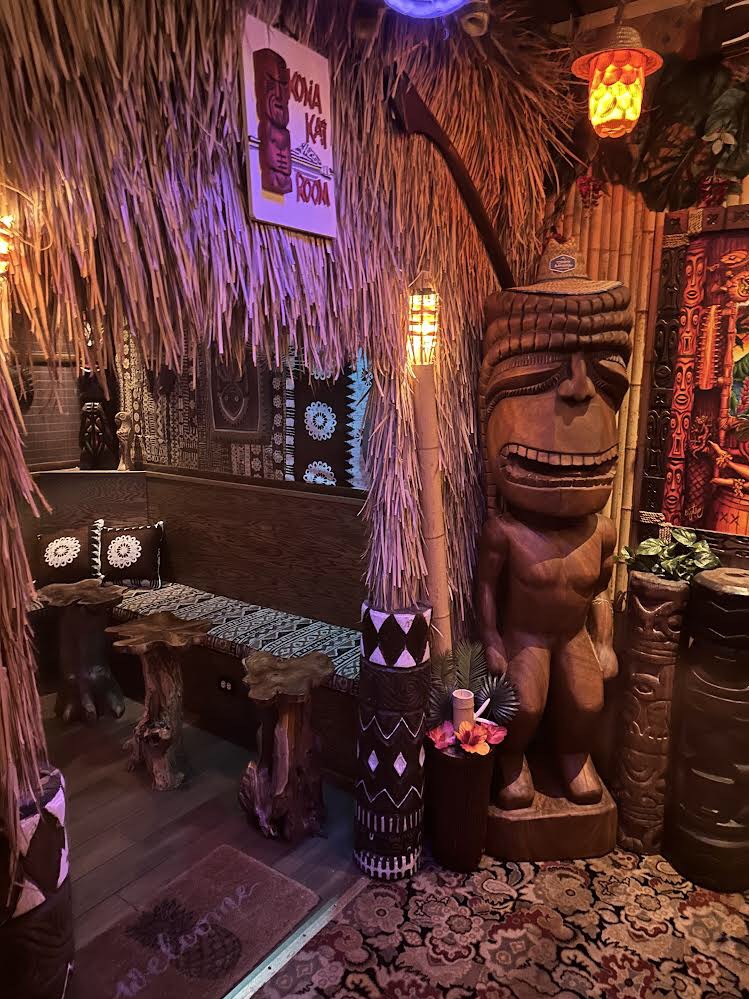 At some point during my visit there, I walked around to get a good look at the place. The Lola’s Pizza aspect of the business had been up and running for years. However, the Kahala Koa part had only been operational since the restaurant had moved to its current location during covid. The tiki had taken over the entire place yet looked great and like it had been there for decades. There was even a water feature in one far corner of the main dining room. I later learned that the owner had bought furniture, lamps and other décor from fallen, long-gone tiki palaces and repurposed them in his new venture. In other words, it truly is vintage tiki. Bravo!