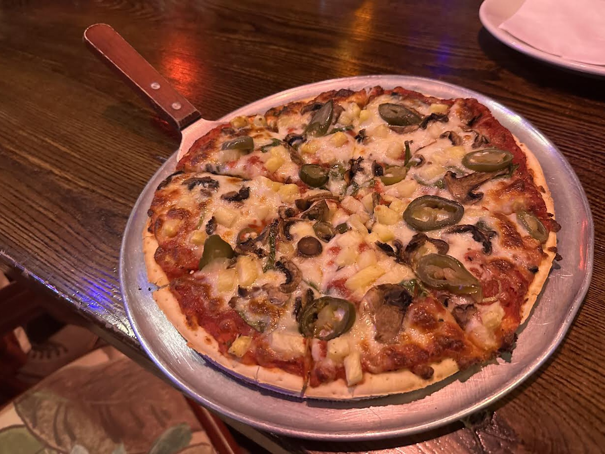 By the time my pizza (jalapeño, mushroom, and pineapple) came, I was ready for another beverage. This time I went with a Sleepy Hollow, which was a creepy-cool blend of rums, citrus, berries, pineapple, and vanilla. It came garnished with a skull toothpick, a pumpkin-shaped piece of candy, and a little plastic bone. Ha! How morbidly marvelous.